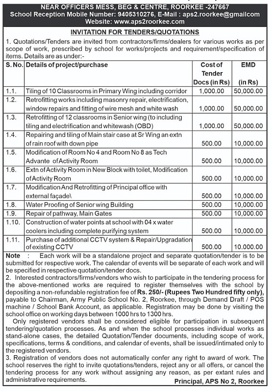 Army Public School No. 2, Roorkee invites sealed quotations/tenders from registered contractors, firms, and dealers for execution of various civil, electrical, repair, retrofitting, and procurement works in the school campus.