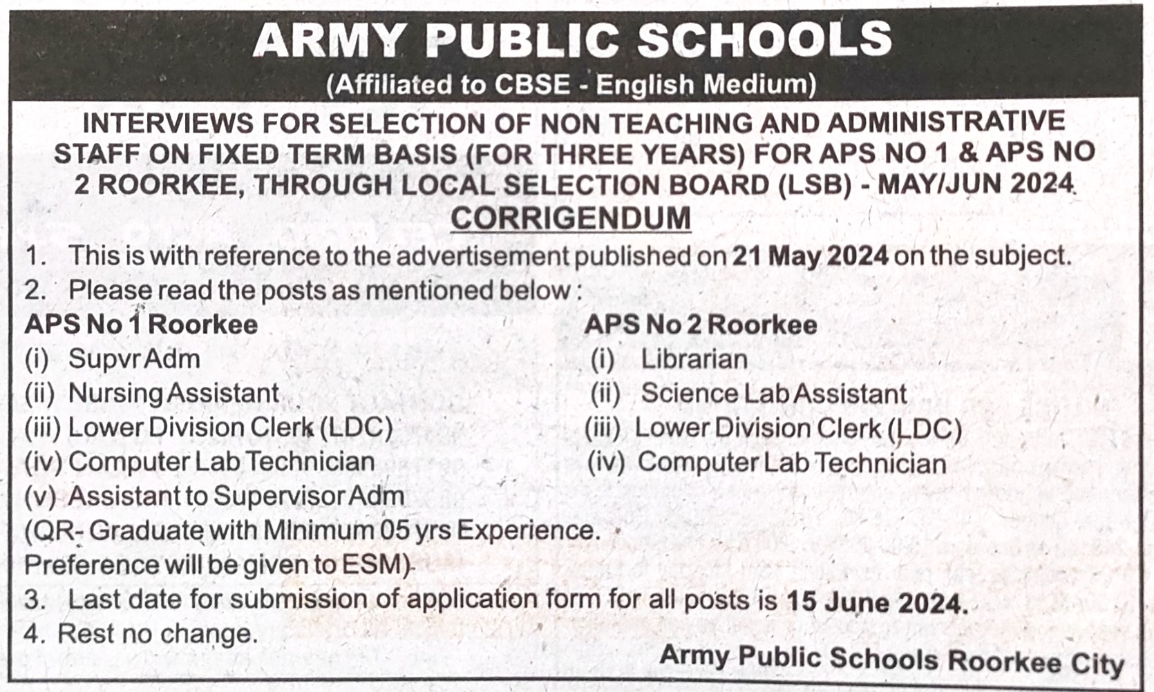 1. Reference to the vacancies published in school advertisement on Tuesday, 21 May 2024, in local daily newspapers Amar Ujala (Dehradun Edition) and corrigendum published on 05 Jun 2024.